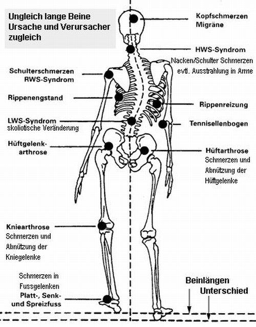 Eine Ursache für eine Vielzahl von Wirbelsäulenerkrankungen, sind ungleich lange Beine. Mit der sanften Wirbeltherapie nach Dorn lassen sich solche funktionelle Beinlängendifferenzen fast immer ausgleichen. Die Gelenke werden nach der Behandlung wieder gleichmässig belastet und Arthroseschmerzen und Beschwerden der Wirbelsäule können sich beruhigen.